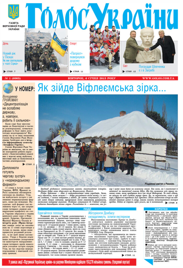 Founded in 1991 shortly before the dissolution of the Soviet Union, Holos Ukrainy (Голос України, Voice of Ukraine) is one of the most important Ukrainian dailies and a newspaper of record. Partially funded by the state, the newspaper is the official organ of the Ukrainian parliament, the Verkhovna Rada. Committed to non-partisan reporting on domestic political affairs, the newspaper’s primary focus is the coverage of politics, policy, legislative matters, and economic issues affecting Ukraine. One of the most important and primary functions of the newspaper is the coverage of parliamentary debates, legislative initiatives, policy deliberations, and the dissemination of new legislation.
