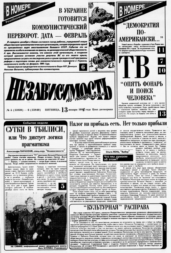 Established in 1991 on the eve of the Ukrainian declaration of independence, Nezavisimost’ (Независимость, Independence) was an independent, high-profile Russian-language daily and a successor publication to Komsomolskoe znamya (Komsomol Banner, initially called Stalinskoe plemya [Stalin’s Tribe]), with a long history as a Soviet publication. One of the most popular newspapers in the early years of Ukrainian independence, Nezavisimost’ covered domestic and international politics, business and economic affairs, and popular culture, becoming a lively outlet for social and political commentary, opinion and analysis.