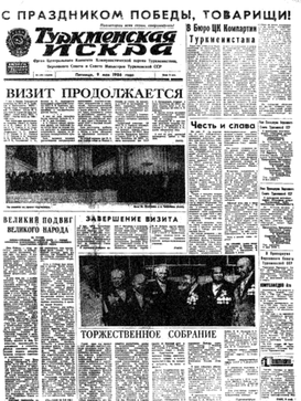 Founded in 1924 in Ashgabat, Turkmenskaia iskra (Туркменская искра, The Turkmen Spark, a derivative of the Vladimir Lenin founded newspaper Iskra) was a Russian-language broadsheet newspaper and the official party organ of the Central Committee of the Communist Party of Turkmenistan.