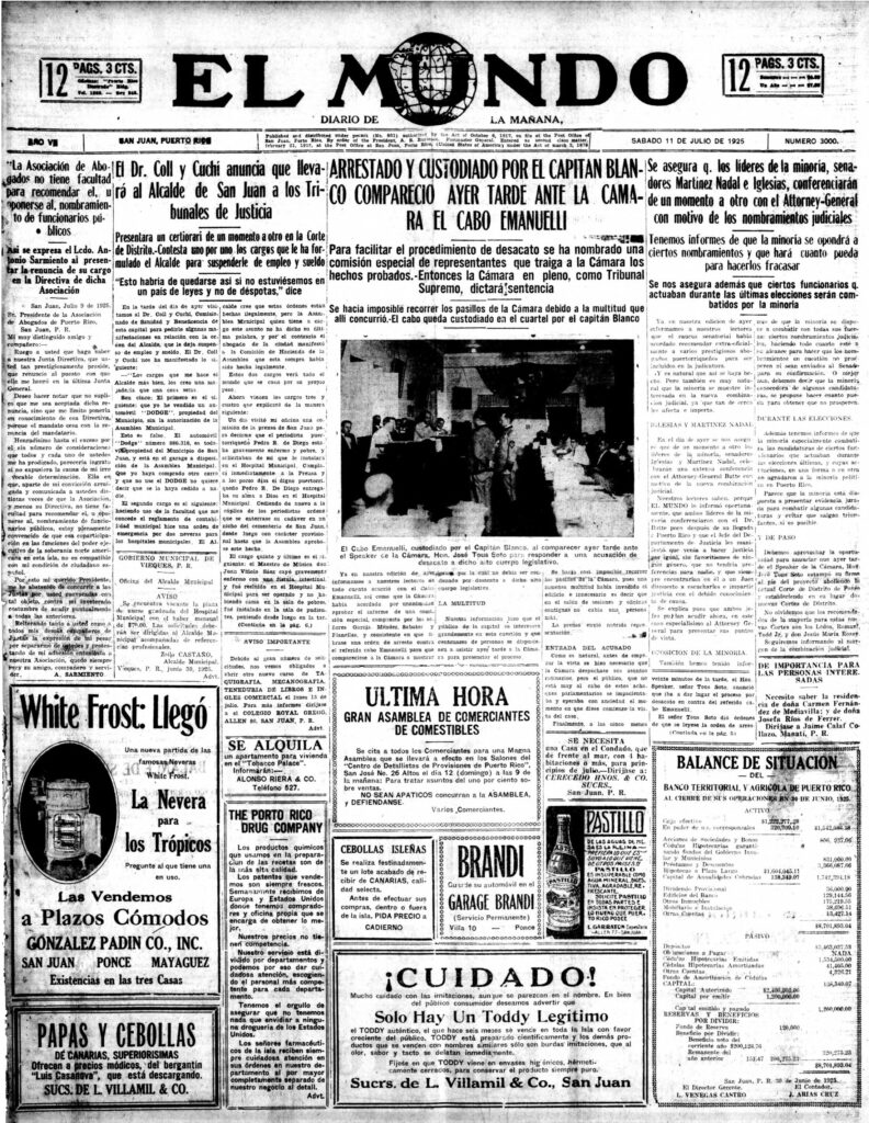 Founded in 1919, El Mundo (The World) was a respected, conservative newspaper from Puerto Rico and was widely considered a key source for news until it ceased in 1990. The paper strived to live up to its slogan “Verdad y Justicia” (Truth and Justice). Key topics covered by the newspaper include industrialization of Puerto Rican society, the Great Depression, territorial relations with the United States including citizenship and activities of independence movements such as the Macheteros and FALN, the rise of the Popular Democratic Party, the Ponce massacre, the Ley de la Mordaza (Gag Law) and more. El Mundo closed temporarily in 1986 following a labor strike. The newspaper never fully recovered from the debilitating strikes of the 1980s and ongoing union difficulties. It did reopen in January 1988, only to close again a short while later, ceasing publication permanently in 1990.