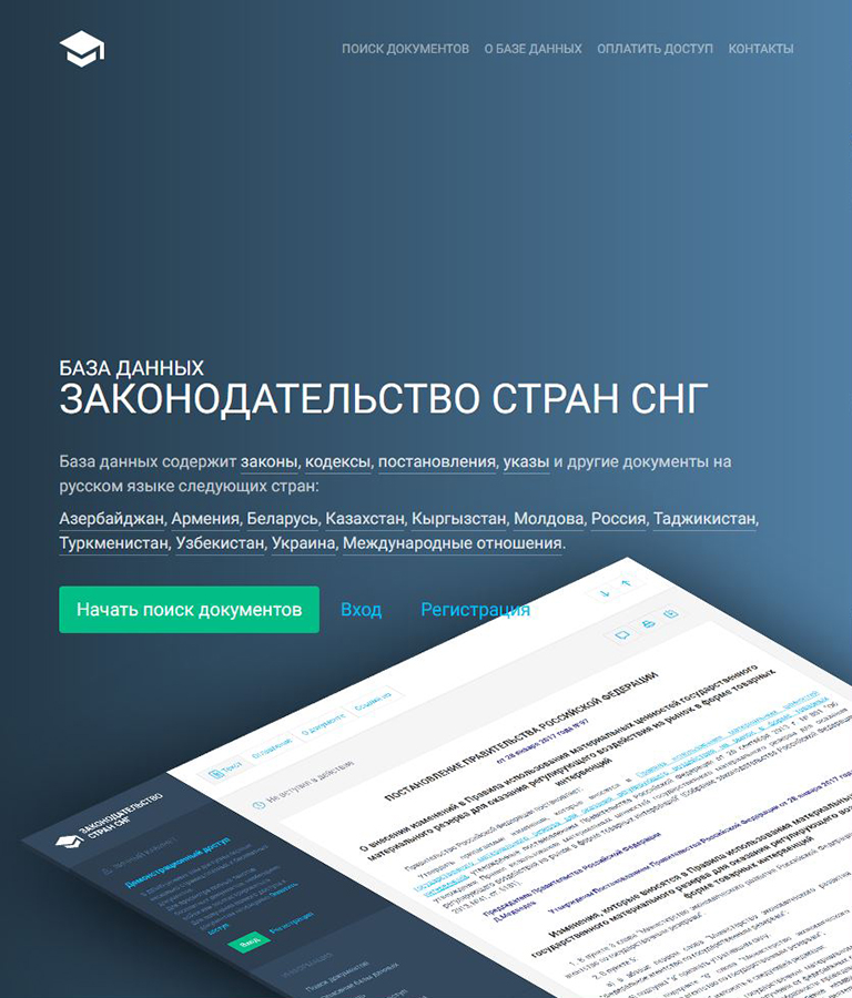 The Legislation of the CIS Countries database includes over 94,000 documents in Russian (over 180,000 documents including old editions). A separate database includes over 40,000 documents in unofficial English translation. The database features: