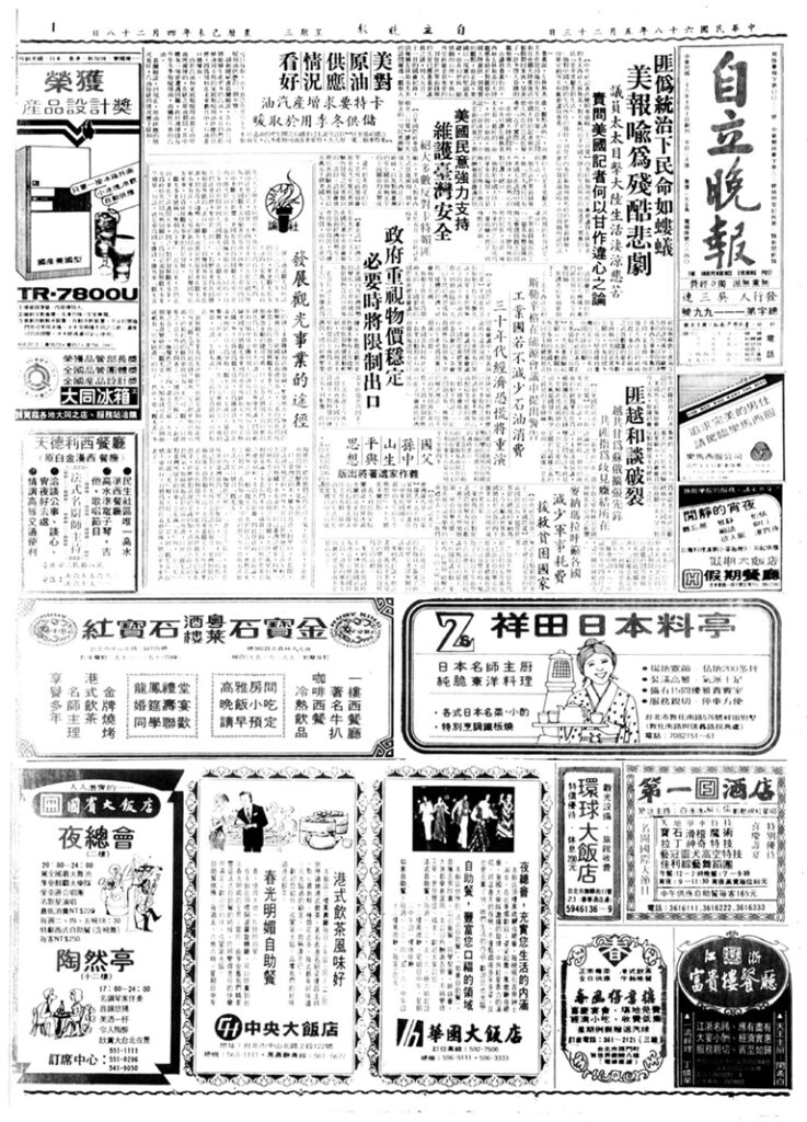 The Kuomintang party was notorious for its use of political repression and violence to maintain the status quo relationship between China and Taiwan. Dissident publications were not tolerated and most of the currently published newspapers in Taiwan either historically supported the Kuomintang party or were formed after press restrictions were lifted in 1987. The Independence Evening Post Digital Archive offers rare, unfiltered insight into important historical incidents that occurred under the Kuomintang regime and is an important resource for studying the history of the pro-democracy Tangwai movement.