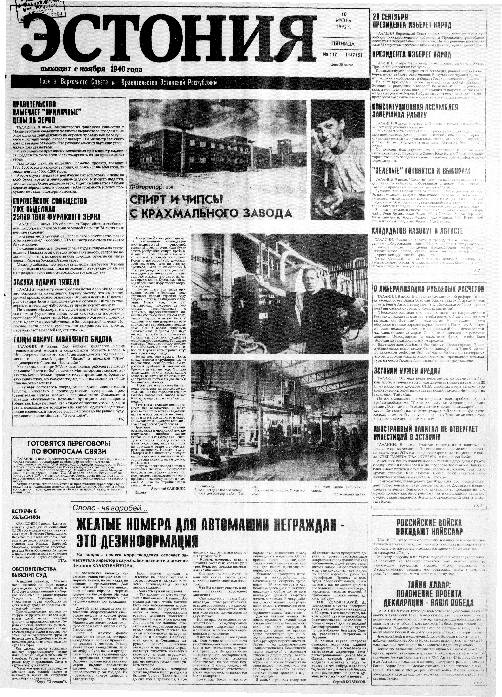 Founded in 1991, Estoniia (Эстония, Estonia) was a popular Russian-language broadsheet newspaper published in Tallinn. Established on the basis and the support of the editorial team of the defunct newspaper Sovetskaia Estonia (Советская Эстония, Soviet Estonia) soon after the Estonian declaration of independence, Estoniia was one of the earliest privately owned newspapers in the country. Modeled after popular Western newspapers, it was dedicated to covering domestic and foreign politics, the economy, culture, the arts, and literature.
