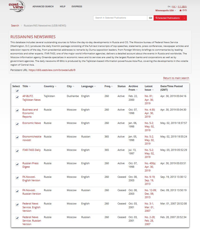 Access the most authoritative newswires from Russia and the former Soviet Union with the Russian/NIS Newswires (UDB-NEWS) collection. This collection includes several outstanding sources to follow day-to-day developments in Russia and other countries of the former USSR: from presidential addresses to remarks by Duma opposition leaders, from Foreign Ministry briefings to commentaries by leading economists and other experts.