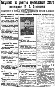 Much has been written about the assassination of Pyotr Stolypin, who headed the Russian government at the time of his death on September 1911. As head of the Russian government amid massive protests of workers and peasants against the autocracy, Stolypin was firm in suppressing the protests, but he also started programs to reform, first and foremost, Russia’s extensive farming community, the government infrastructure, and economy. Most authors have based their narratives on reminiscences and historical press accounts while only a few researchers used archive sources. This unique collection of the archive-based information includes documents little known to both the broad public and the scholarly community. The collection includes such materials from the State Archives of Kyiv Oblast as the correspondence of the investigator of the Kyiv circuit court concerning the killer Dmitri Bogrov and other revolutionaries implicated in Stolypin’s assassination as well as the report to the prosecutor of the Kyiv circuit court about the murder, the record of Bogrov’s questioning, and the report on the site and time of Bogrov’s execution.